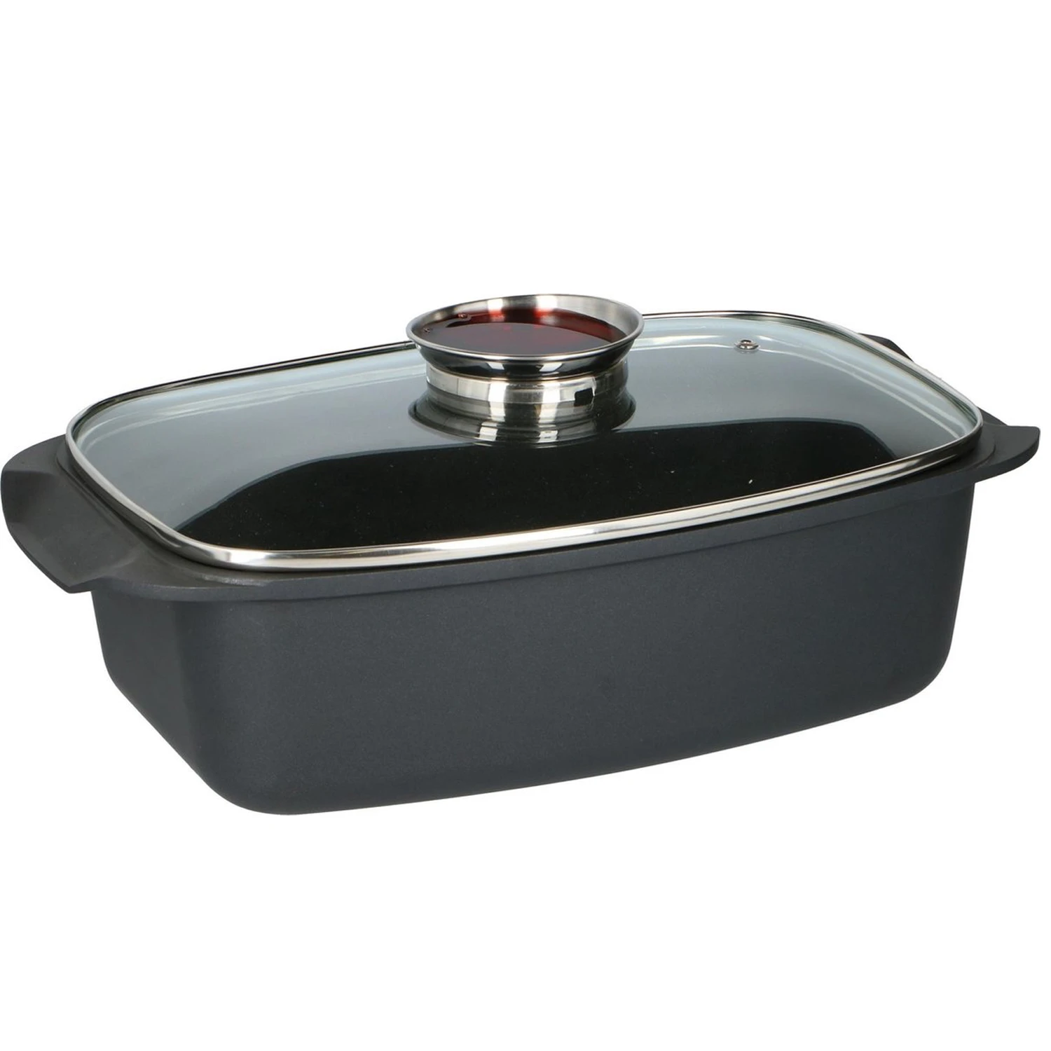 Braad de meest heerlijke gerechten in deze Alpina braadslede van gegoten aluminium. De braadslede is geschikt voor veel verschillende warmtebronnen behalve inductie. Gebruik de braadslede om gerechten vetarm te koken of smoren. De braadslede heeft een duurzame anti-aanbaklaag van Teflon-kwaliteit en wordt geleverd met een hittebestendig deksel. Het deksel heeft een aromaknop waardoor je vloeistoffen zoals wijn of bouillon druppelsgewijs kunt toevoegen. De braadpan heeft een afmeting (zonder deksel) van ca. 39,5 x 22,5 x 10,8 cm en met deksel ca. 40 x 22,5 x 15,5 cm.