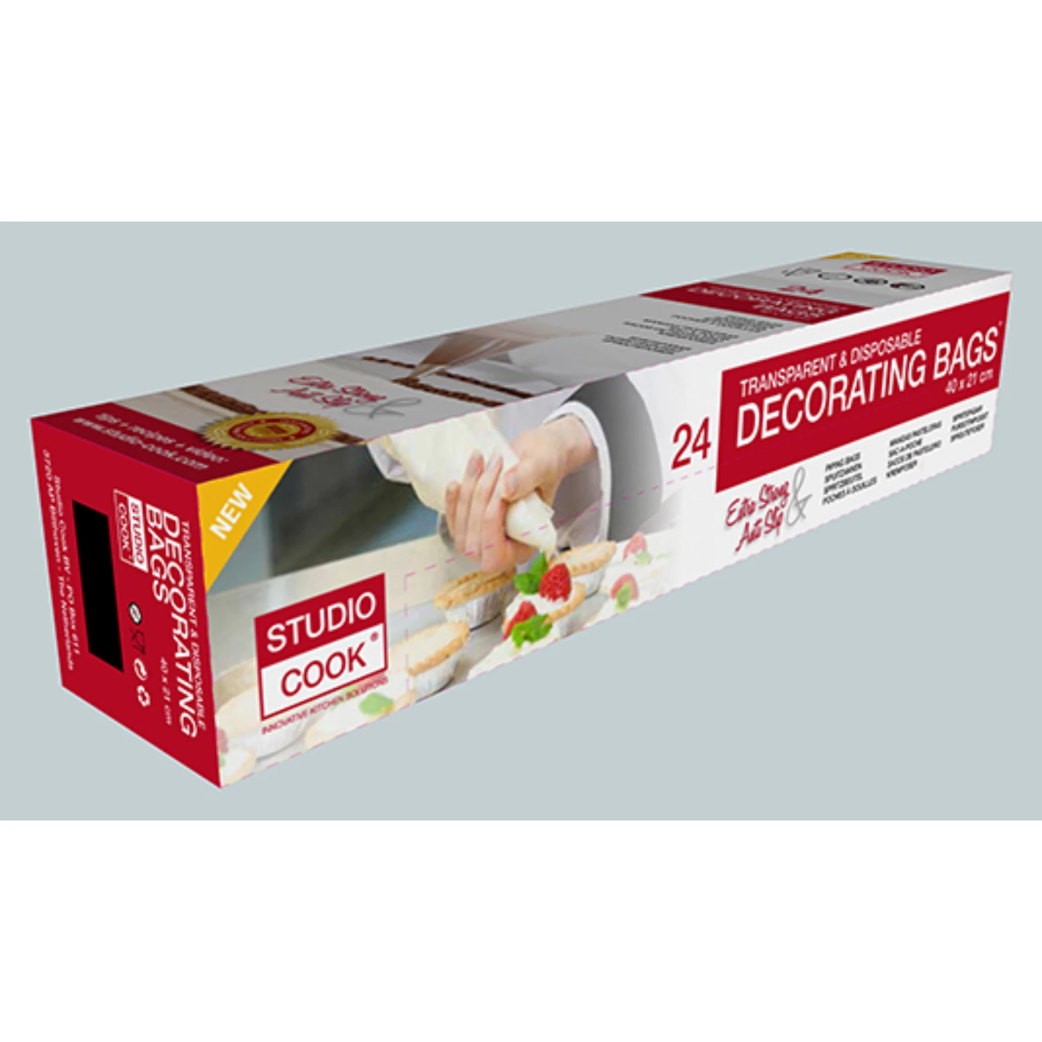 Als jij op zoek bent naar een manier om jouw taarten nog mooier te maken? Dan is een decoratieve spuitzak precies wat jij nodig hebt. Met deze zakken breng jij moeiteloos slagroom of schuim aan op jouw baksels. De zakken zijn transparant en geschikt voor eenmalig gebruik. De verpakking bevat 24 spuitzakken, met een formaat van 21x40cm.